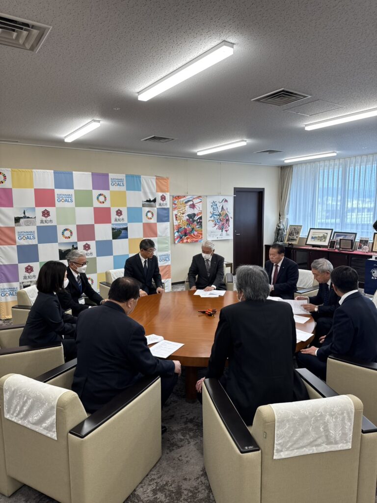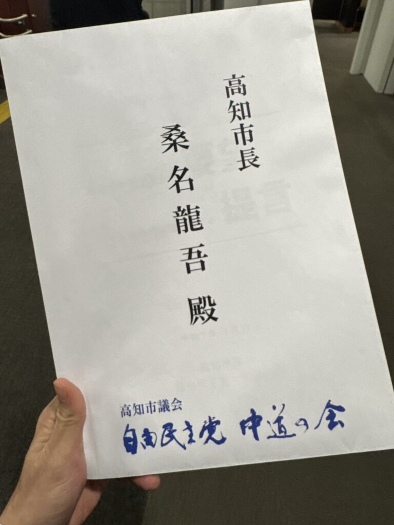 本日、桑名龍吾高知市長に対し、弘瀬副市長、神谷副市長同席のもと、我々自由民主党・中道の会14名で来年度予算への要望及び中長期的な課題に関する提言活動を行いました。
