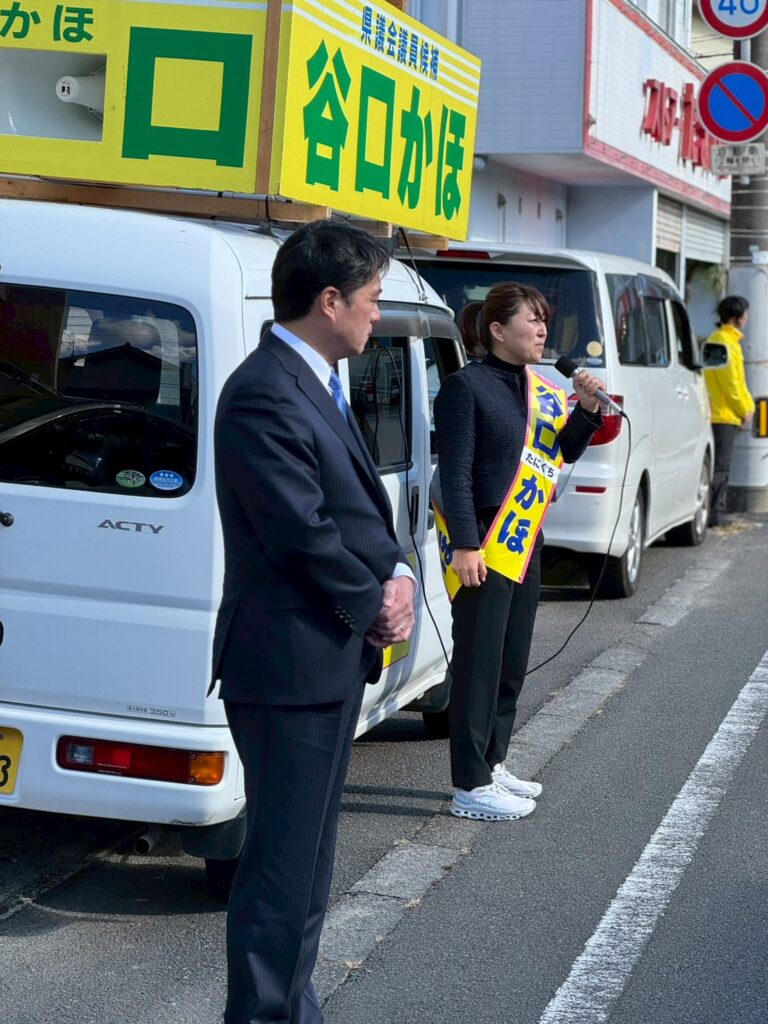 県議会議員補欠選挙2日目。谷口かほ候補の応援に、尾﨑正直内閣官房副長官をはじめ、多くの仲間と共に応援に入りました。