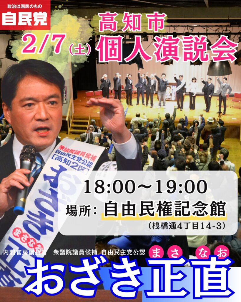 今週末 2月7日(土)、おざき正直衆議院議員候補 高知市個人演説会を開催いたします。