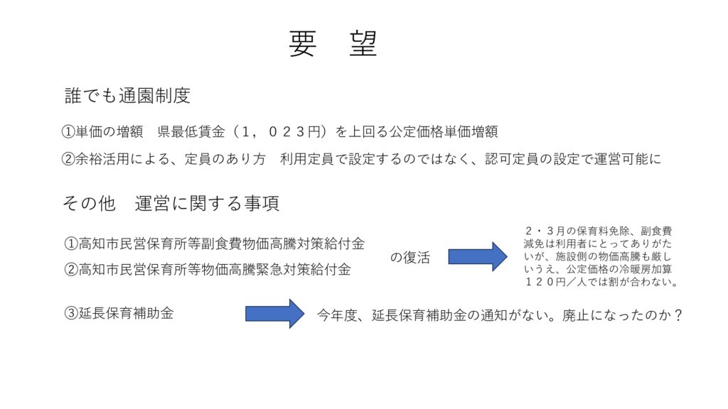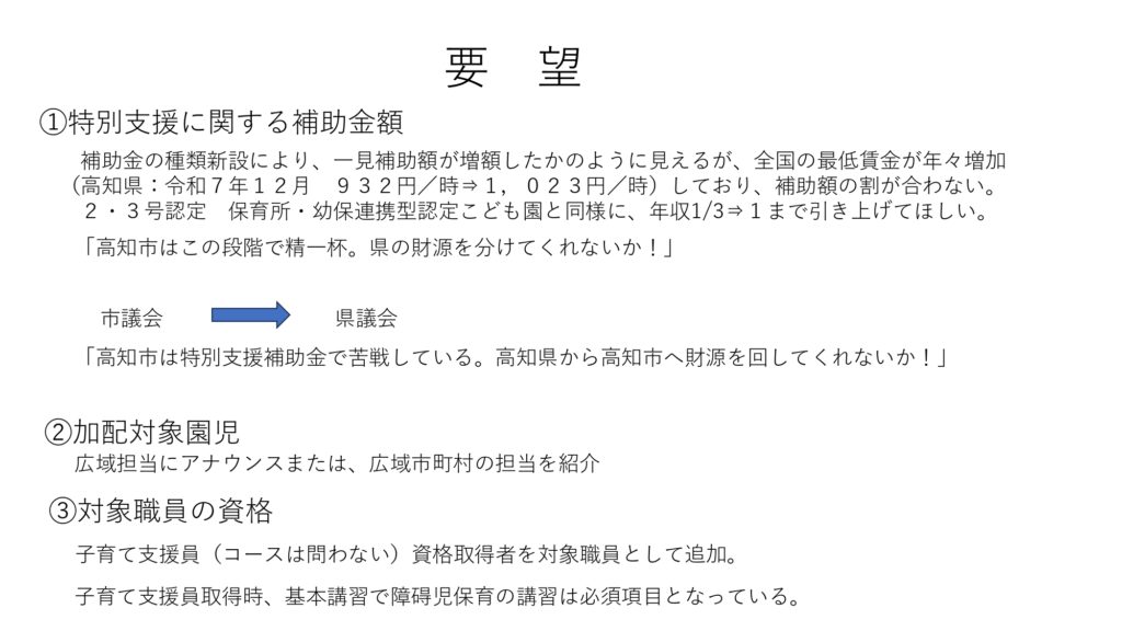 ・自治体への要望: 高知市独自での単価引き上げや、県・国への強い働きかけが必要