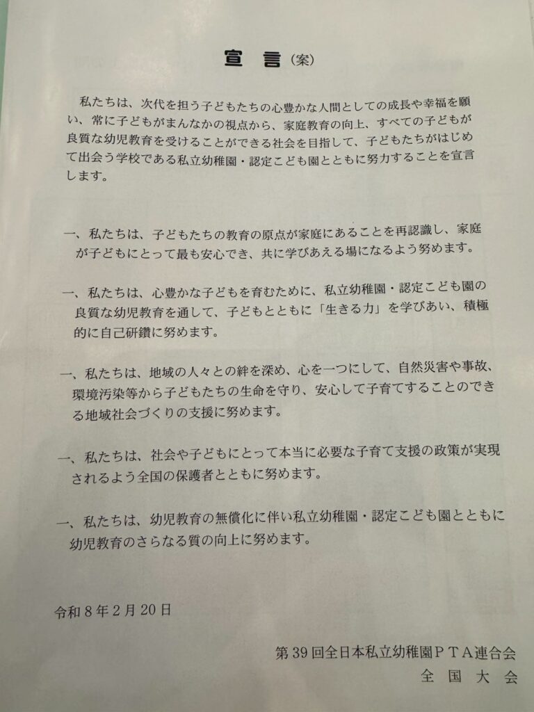 」の視点に立ち、家庭・園・地域が連携し、すべての子どもが良質な幼児教育を受けられる社会の実現を目指す宣言」が全会一致で決議されました!
