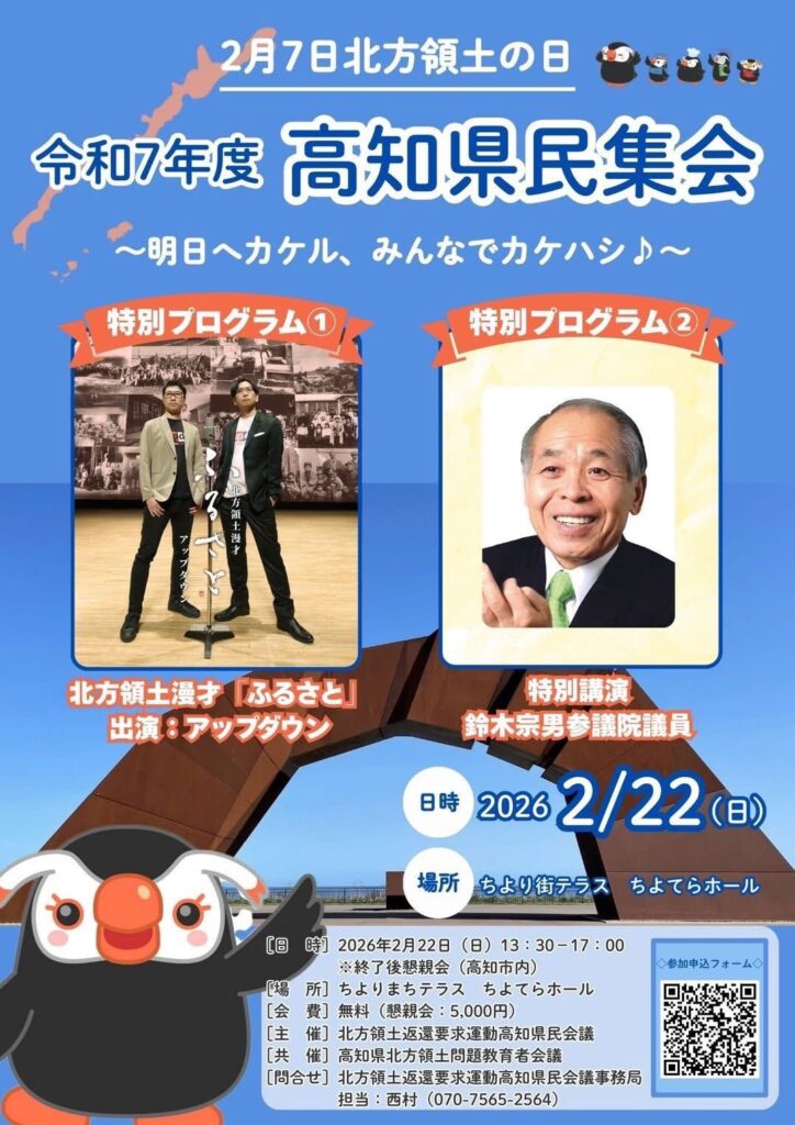 本集会は、北方領土返還要求運動高知県民会議主催のもと開催され、今年度の活動報告やKAKEHASHI披露、特別プログラムとして鈴木宗男参議院議員による基調講演、アップダウンによる北方領土漫才が披露されました![]()