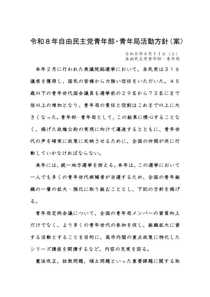 【令和8年自由民主党青年部・青年局 活動方針(案)】