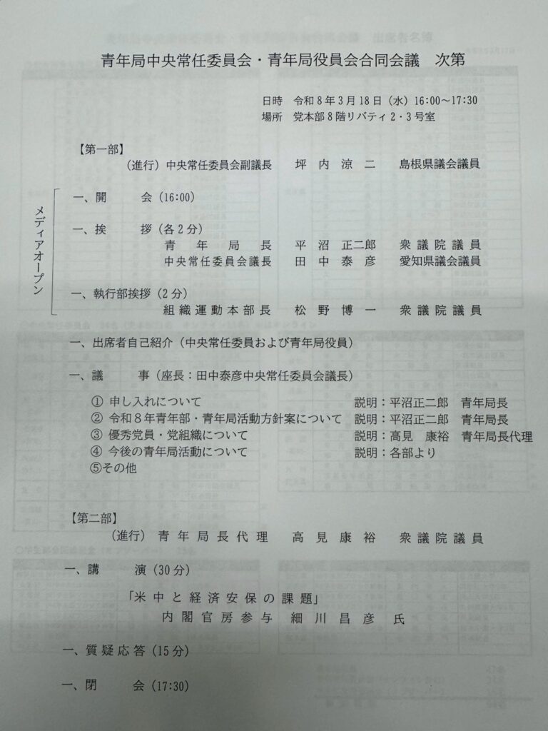 先日開催された「青年局中央常任委員会・青年局役員会合同会議」に、桑鶴局長と共に、議会中のためオンラインにて出席しました![]()