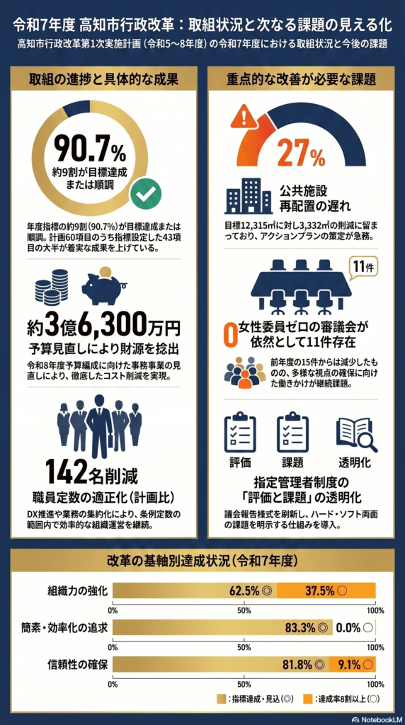 まず、行政改革第1次実施計画(R5〜R8)におけるR7年度ついては、指標設定された43項目のうち、29項目(67.4%)が年度目標を達成または達成見込みであり、8割以上の進捗を含めると約9割が順調に推移しています。一方で、女性委員未配置の審議会が11件残っていること、公共施設の延床面積削減が目標(12,315㎡)に対し3,332㎡に留まっていること、リスク報告件数が前年より増加していること、市税等の未収金が増加していることなど、複数の課題が明確に示されました。